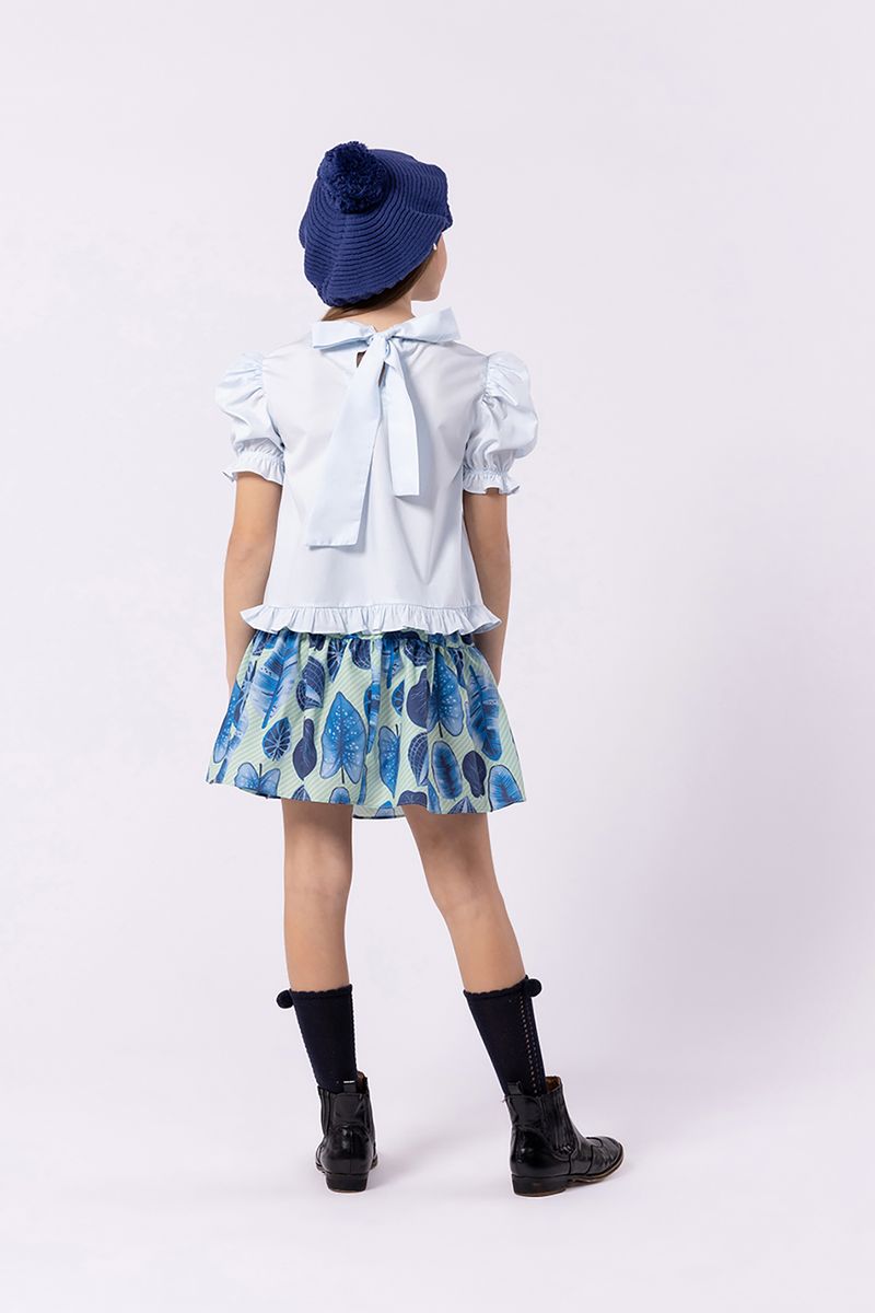 Conjunto infantil para menina de bata e saia em tricoline com estampa exclusiva de folhagem. O conjunto é composto por batatricoline lisa com decote redondo e mangas puff com elástico na barra formando babadinho. Abertura com faixa para dar laço.