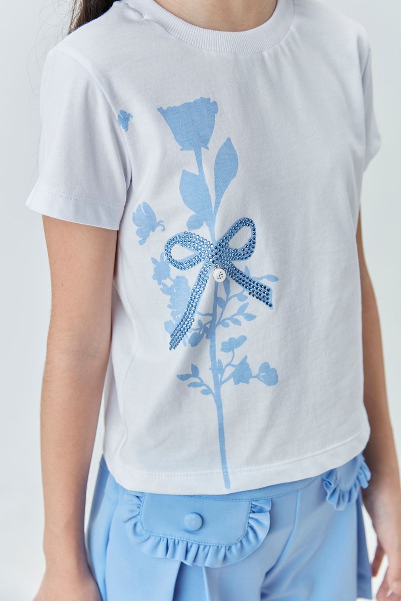 Conjunto Infantil Um Mais Um ideal para Meninas. Blusa de Malha 100% Algodão com estampa de flores e laço com aplicação de strass, short de malha ponto roma com detalhe de lapela com babadinhos e botão encapado. Sofisticado.