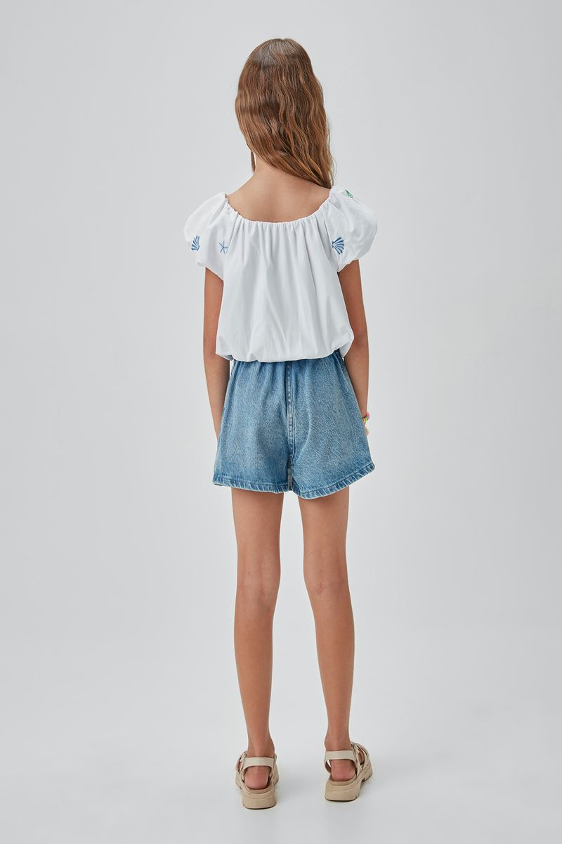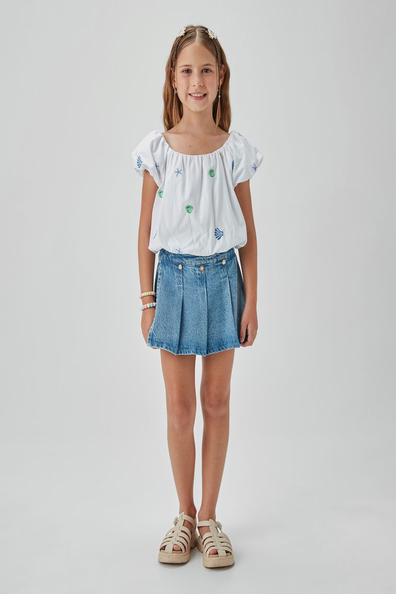 Blusa Um mais Um, com elástico no ombro e no decote, mangas balonê e corpo balonê. Bordado personalizado da marca, com motivos de fundo do mar. Versátil.