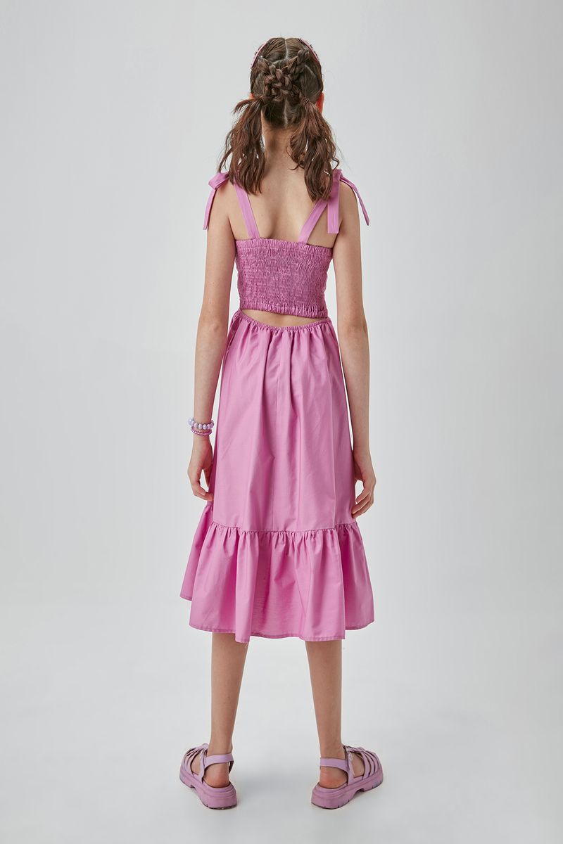 Vestido Um Mais Um midi confeccionado em tricoline. Possui alças ajustáveis com laços e aplicação de flores feitas à mão no busto, trazendo charme e feminilidade à peça. A saia conta com leve franzido e um babado amplo, que garante movimento e fluidez. O detalhe em lastex na parte posterior proporciona conforto e ajuste ao corpo, complementado pela abertura nas costas para um visual moderno e elegante.