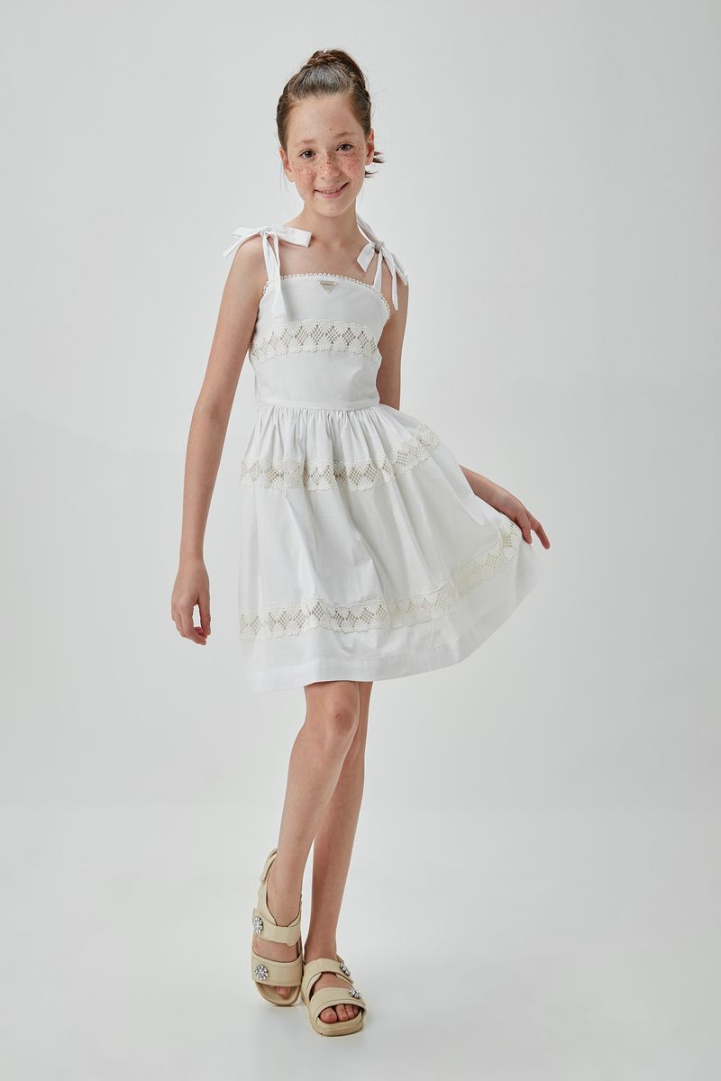 Vestido Um mais um rodado em tricoline 100% algodão, com detalhe de renda sobreposta. Alças amarradas no ombro. Abertura com zíper invisível nas costas. Placa personalizada da marca em acrílico. Fresco e alegre.