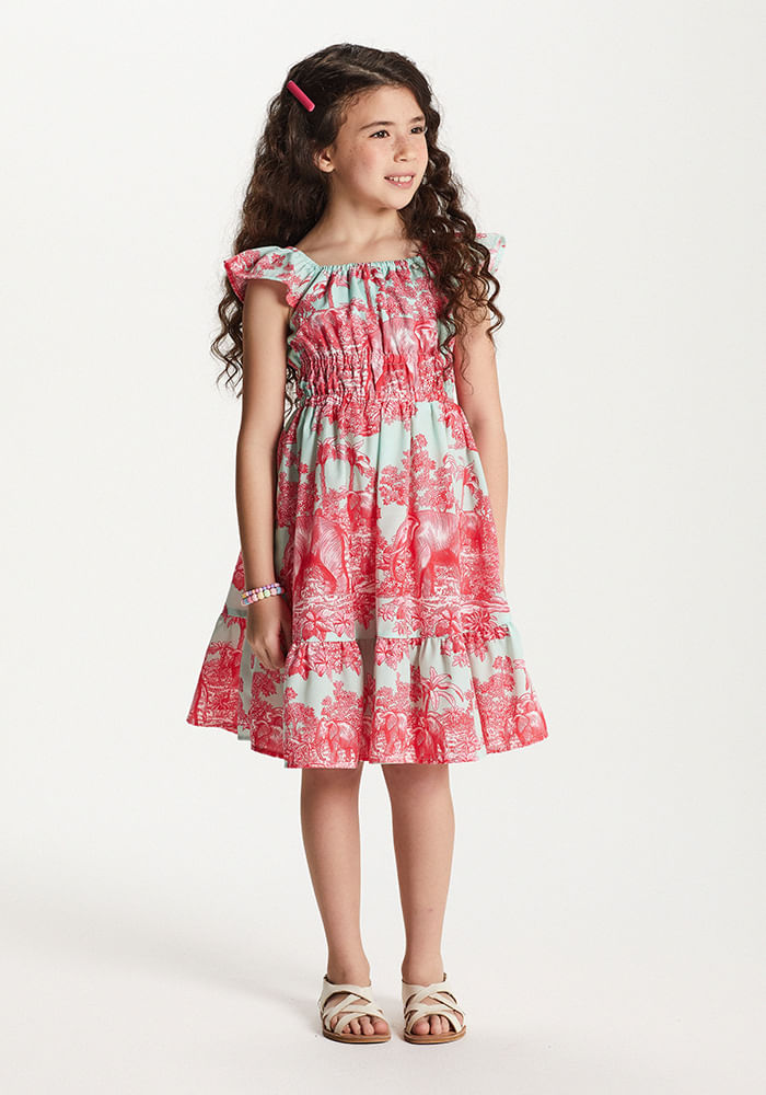 Vestido midi em tricoline leve com estampa exclusiva. Possui decote reto com elástico e lastex no busto, alças com babadinhos e modelagem evasê com recorte na saia.