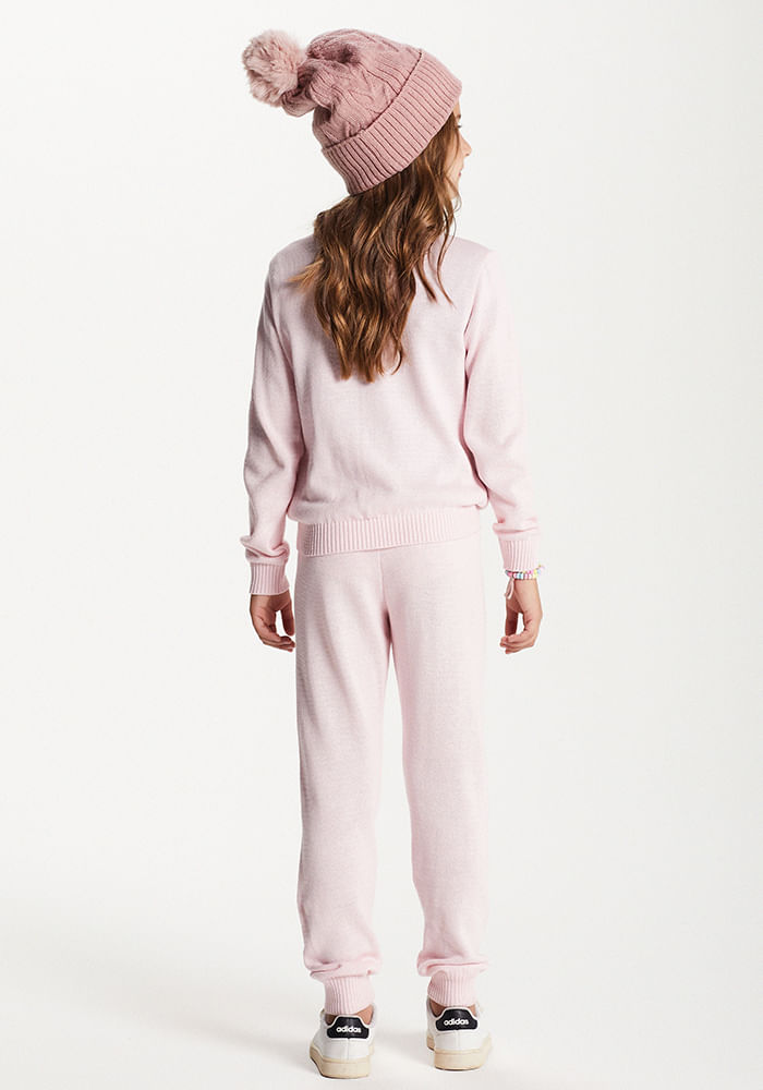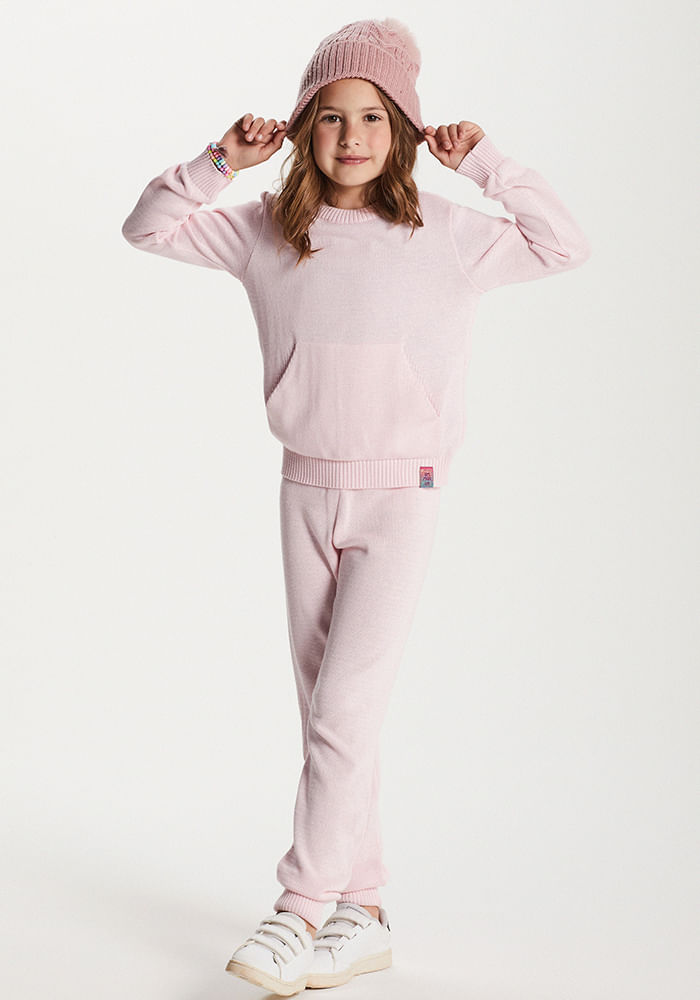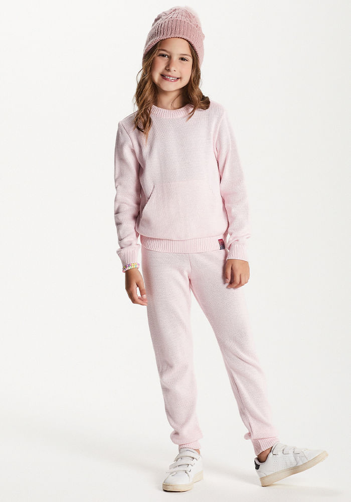 Conjunto Um Mais Um em tricot, perfeito para os dias mais fresquinhos. A blusa tem modelagem reta com decote careca, punhos e barra com acabamento canelado e bolso canguru que traz um toque despojado. A calça tem modelagem ajustada com cós e barra também canelados, garantindo conforto e liberdade nos movimentos.