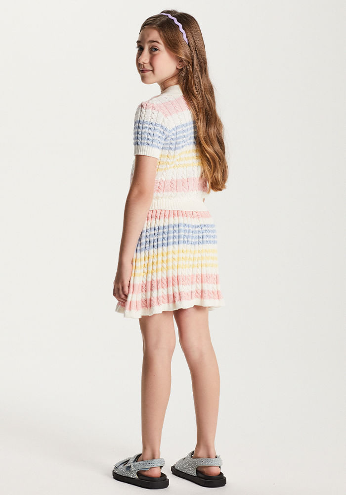 Conjunto Um Mais Um em tricot composto por blusa de manga curta e saia short. A blusa tem modelagem clássica com gola esporte e decote em V, enquanto a saia short possui shape godê com leve babado na barra, unindo charme e conforto. O destaque fica por conta das listras em tons pastel rosa, azul, amarelo e off-white que conferem um visual delicado, alegre e super feminino. Ideal para looks casuais com um toque sofisticado, perfeito para os dias frescos de meia-estação.