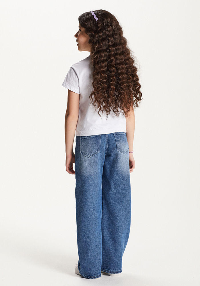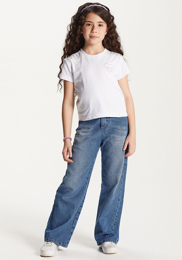 Camiseta em malha de algodão com mangas curtas e gola careca. Bordados delicados nos ombros em formatos de corações e laços coloridos. Bordado frontal em formato de coração com o nome da marca.