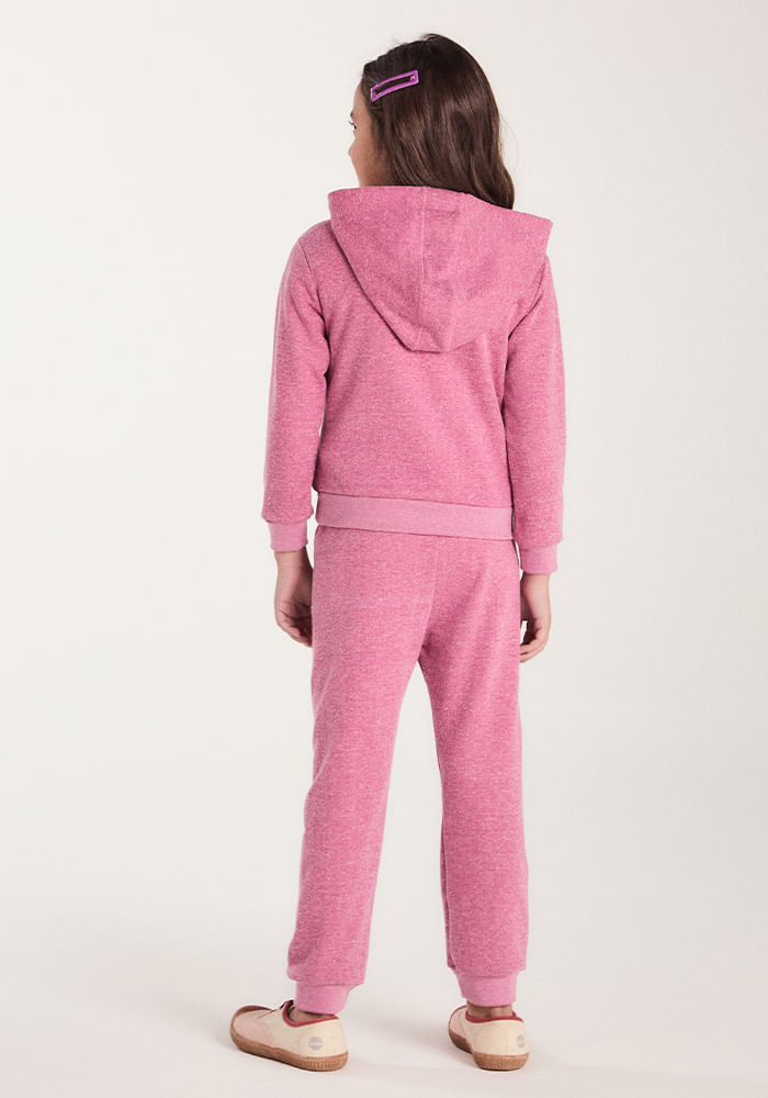 Conjunto de abrigo no moletinho mesclado de algodão com viscose e elástano. Modelo blusa manga longa com punho de ribana, capuz e detalhe de silk frente. Calça básica com cós de elástico pespontado a volta toda e punho em ribana.