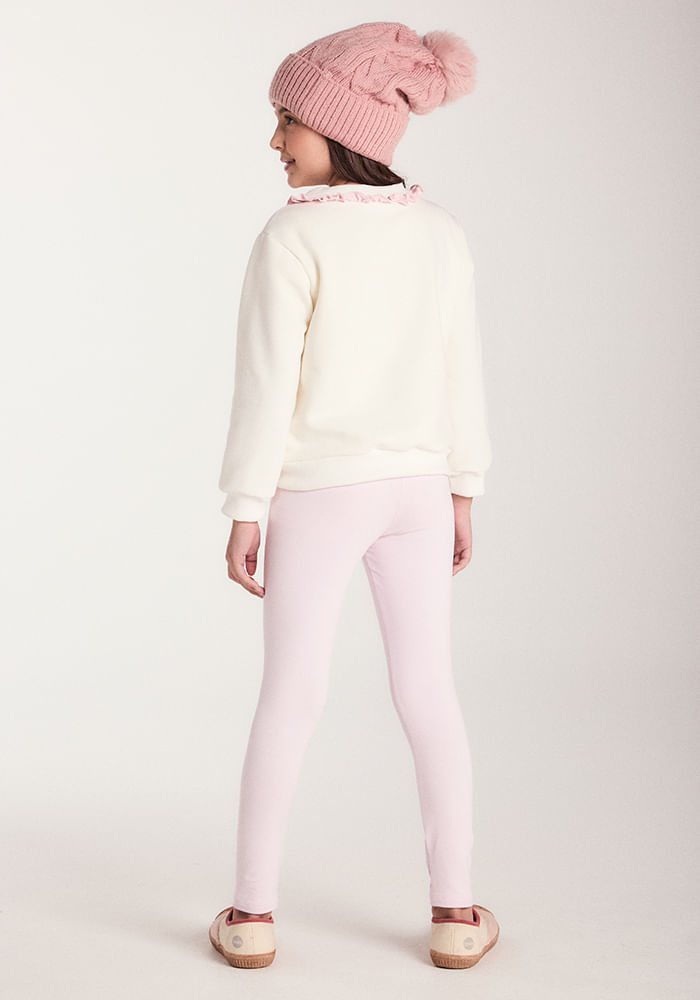 Conjunto de blusa em moletom de algodão sem felpa, manga longa com punho e gola em ribana. Detalhe de silk frente e babado franzido embutido no decote. Calça legging em moletinho de viscose com algodão.