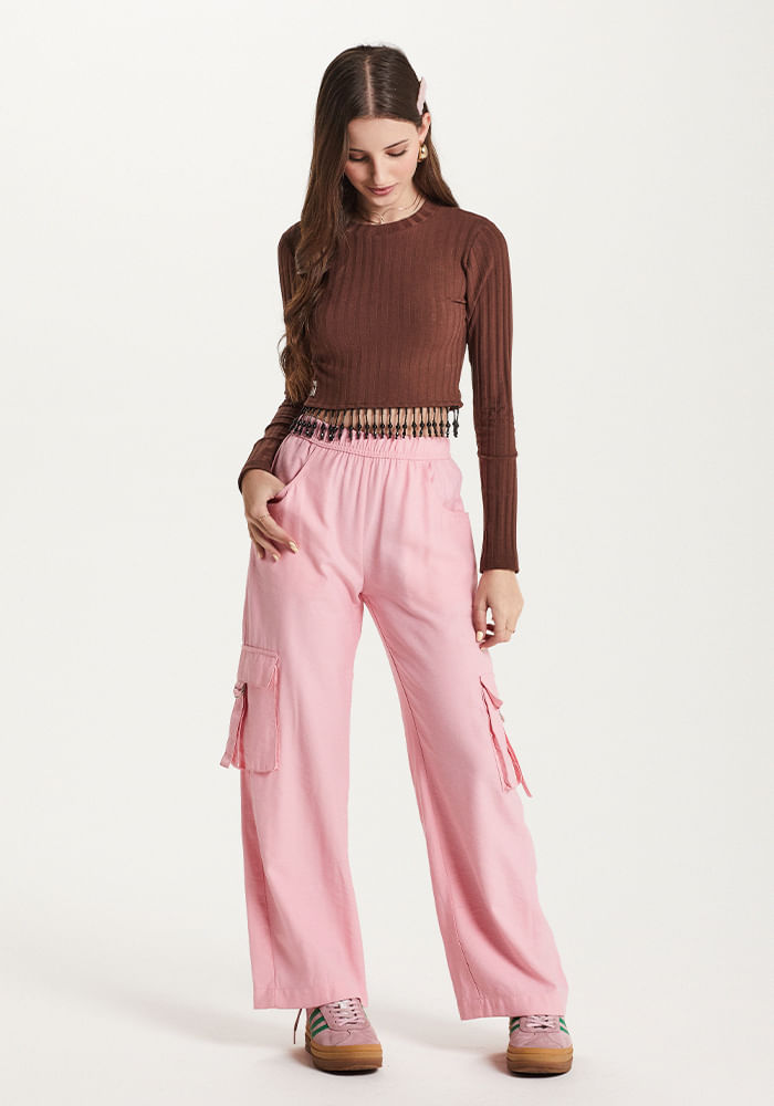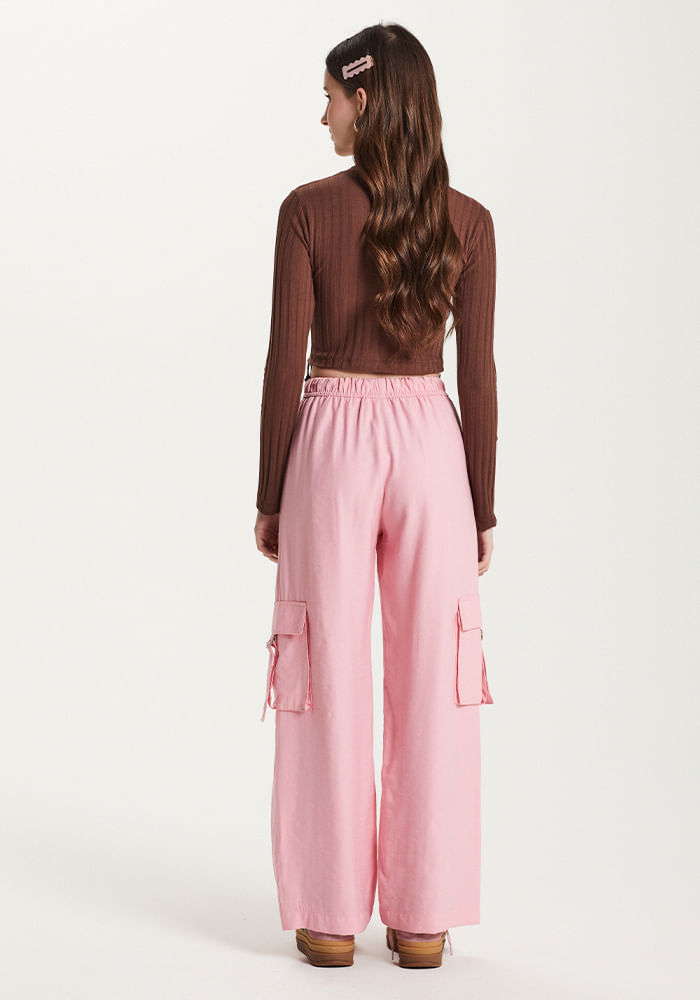 Calça Twoin wide leg em alfaiataria de viscose, tem um caimento leve e fluido, proporcionando sofisticação sem abrir mão da praticidade. Seu design amplo valoriza o movimento e traz um toque contemporâneo ao look. O cós elástico garante um ajuste confortável, enquanto os bolsos laterais adicionam funcionalidade. Os bolsos cargo, com detalhes em argolaa metálicas, dão um ar moderno e despojado, tornando a peça ainda mais estilosa. Versátil, essa calça pode ser combinada com diferentes peças para criar looks casuais ou sofisticados.